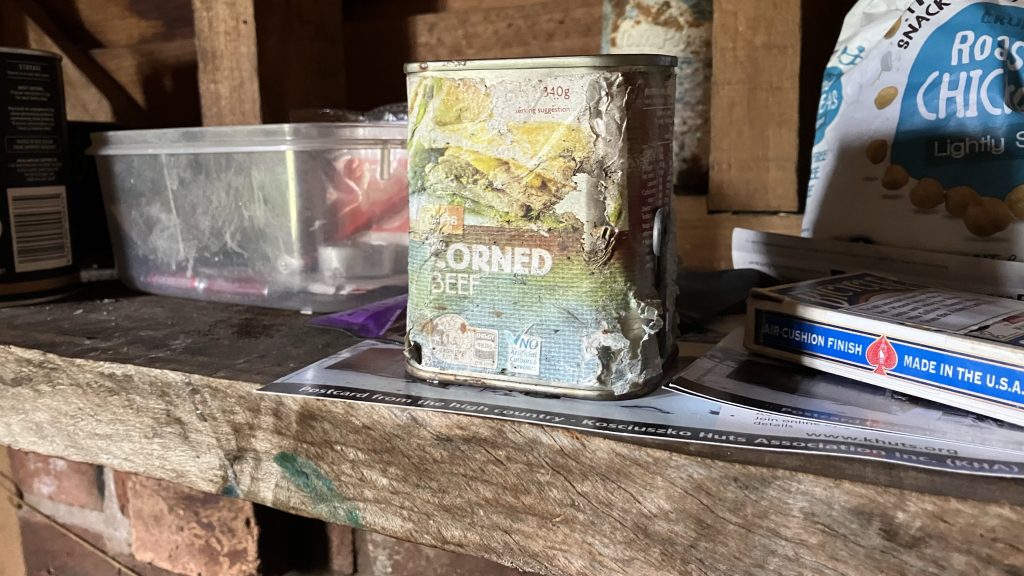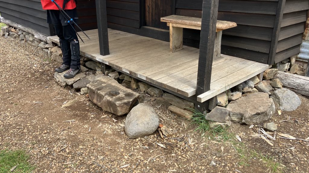 Broken Dam hut is great. It’s very roomy and has a verandah. We sat out what was left of the rain and had lunch. Though tempting, I left the can of off-brand spam sitting on the mantle piece.