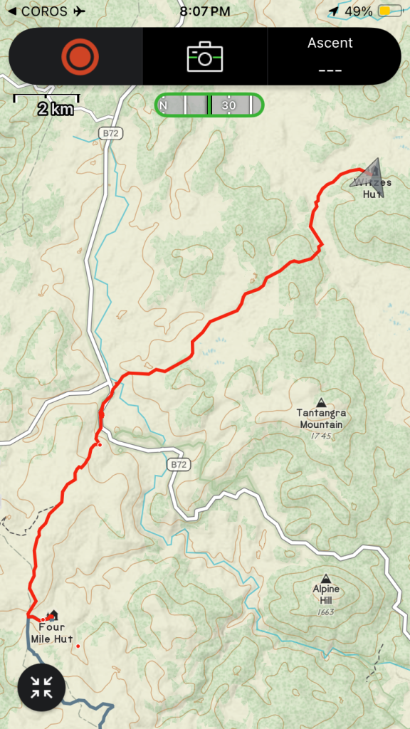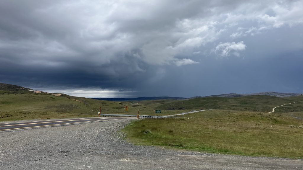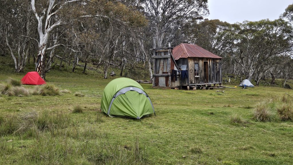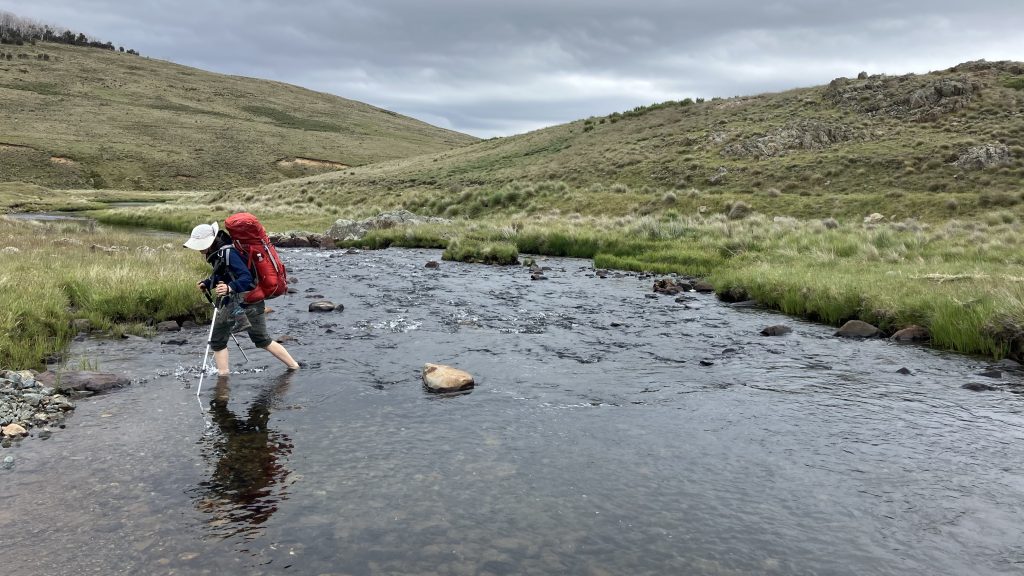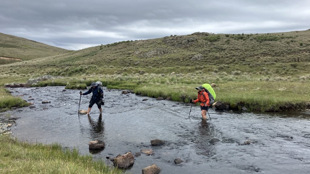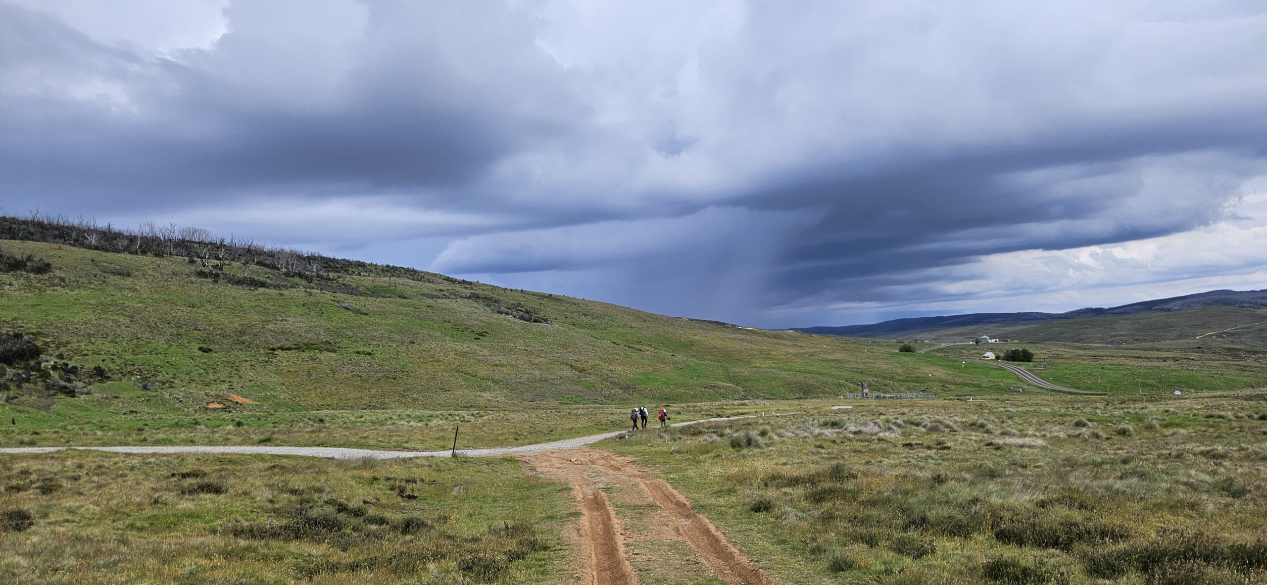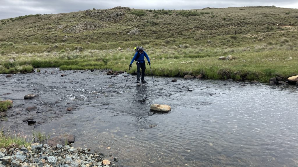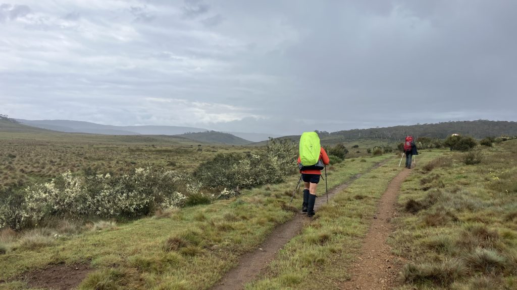 As we crested the hill and looked back over Kiandra, our mistake could be seen creeping up the valley towards us in sheets. As we donned wet weather gear, Scott declared that he’d left his Crocs back at the river. He’d run back and get them and catch up.