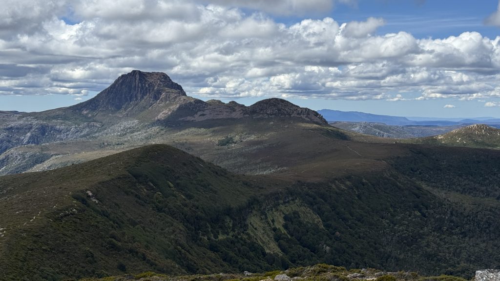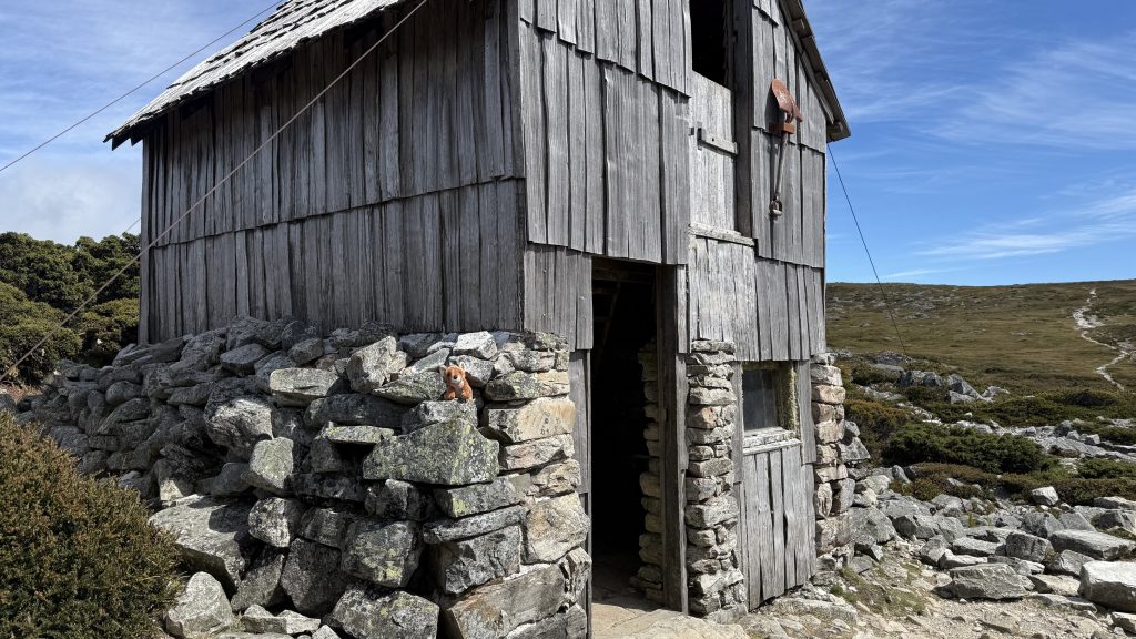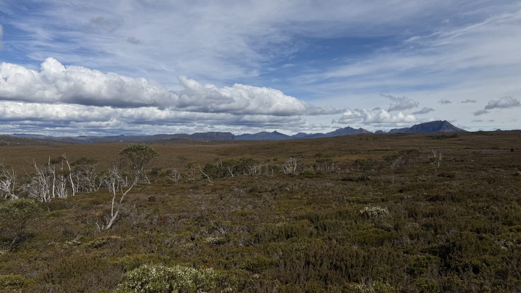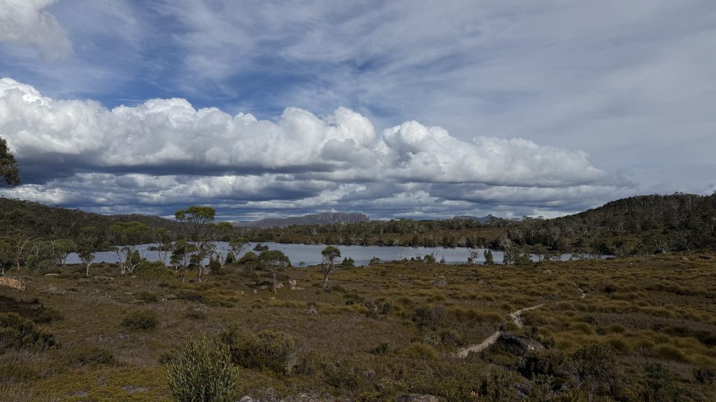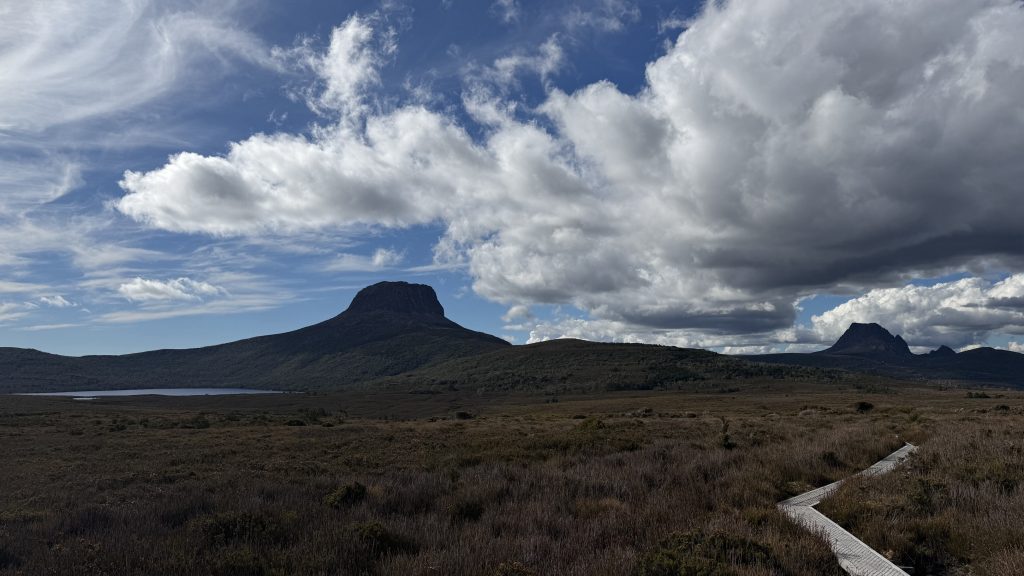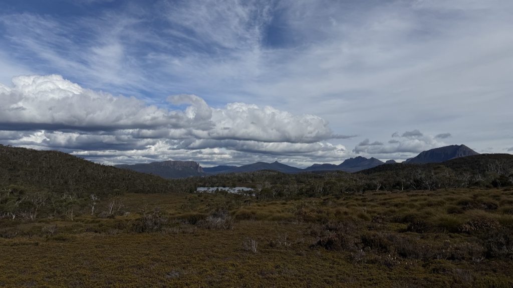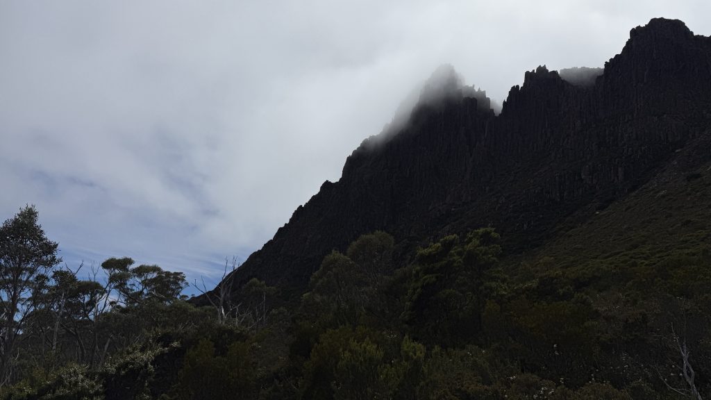 I have a choice to make at Kitchen Hut. As it stands, Cradle is in a sea of blue sky, while Barn Bluff is wreathed in cloud. I waver, but ultimately decide to stick with the plan, on the basis that the cloud might burn off by the time I get there.