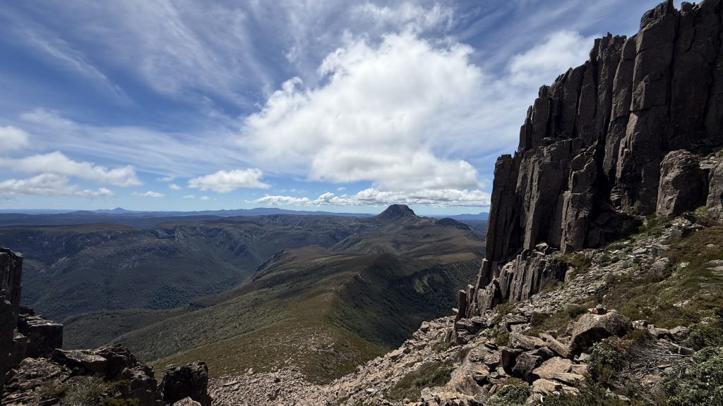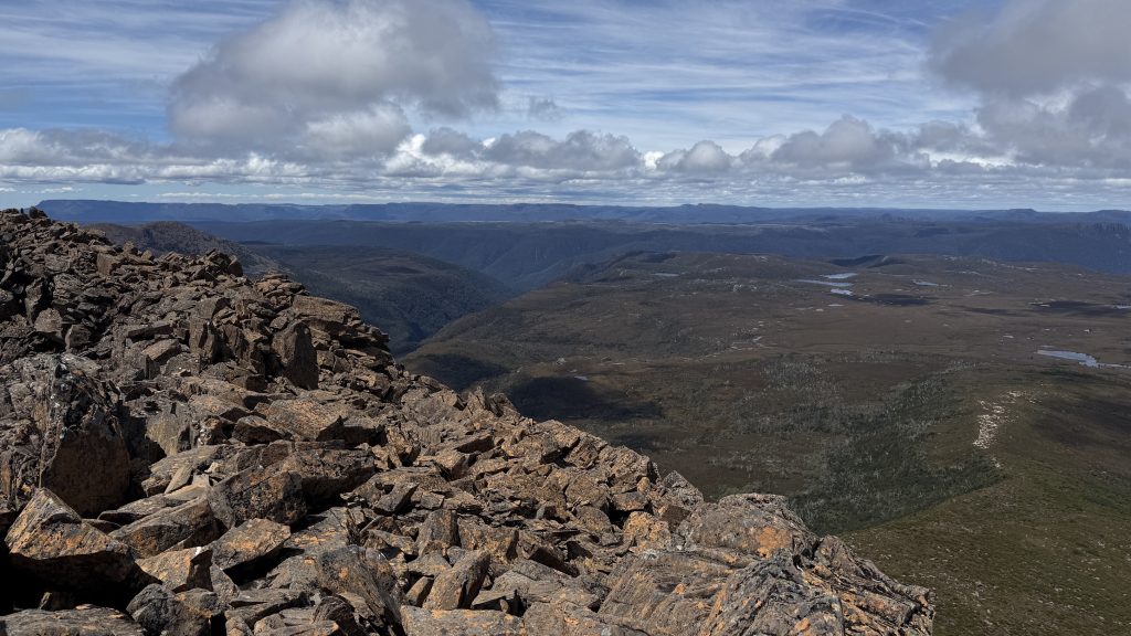 Once you reach the bottom of the dolerite boulder field, it’s a challenging series of rock hops and scrambles, sometimes exposed, to reach the top. And once you get up, you’re on the far end of the mountain from the summit cairn and need to rock hop across to there. So worth it though.