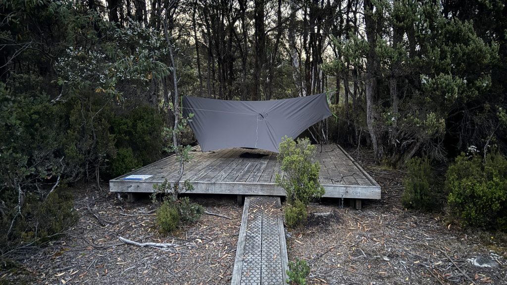 I push on at a decent speed, and make the hut with plenty of time to find a tent platform with trees, get set up, and head back to the hut for dinner.