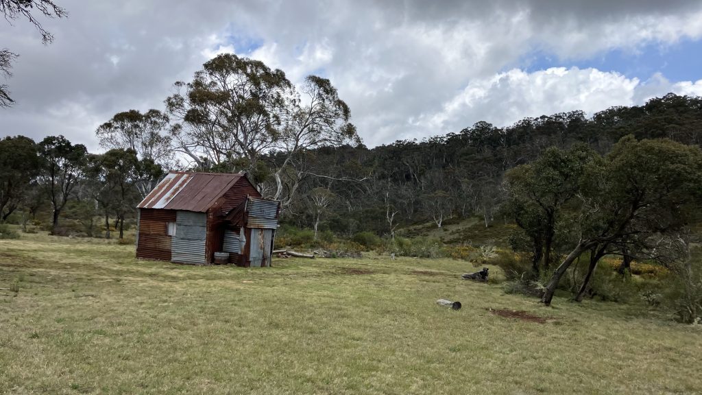 A relaxed meal to celebrate our continued survival, and it was up the hill and along a series of horse tracks to Millers’ Hut. The wind kicked up, trying hard to blow the last of the cloud away, and patches of sun started to appear.
