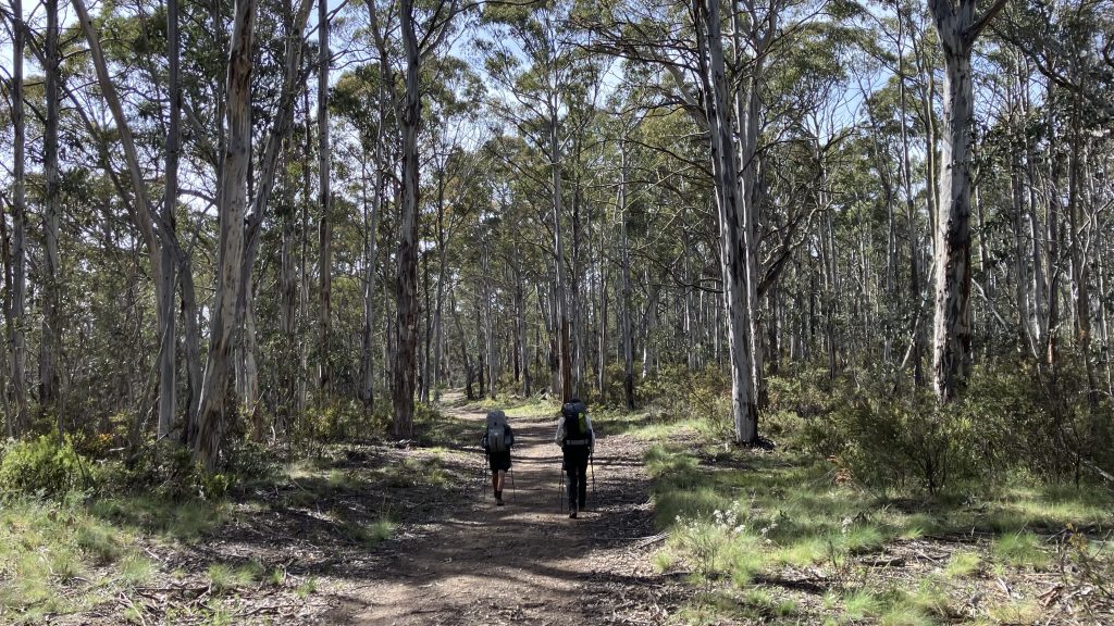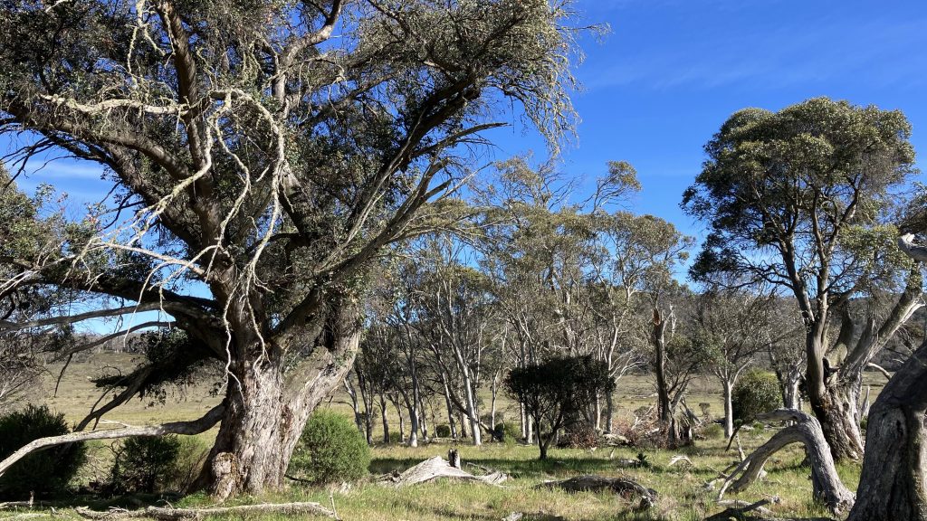 The frost burned off, and the day was bright and warm and lovely. The track passes through some beautiful unburnt forest of snow gum and black sallee.