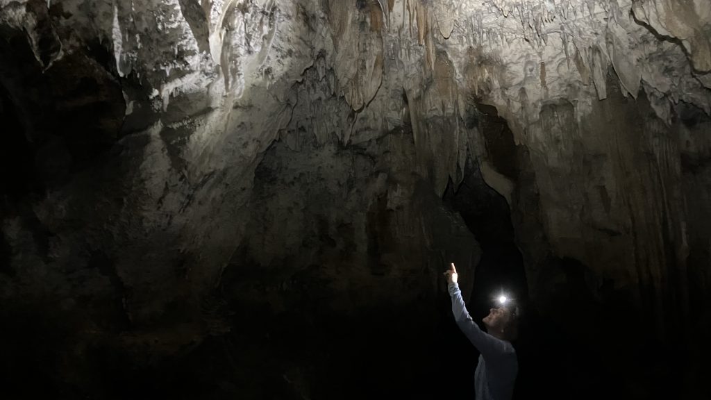 …down to river cave and Glop Pot, small caves worth sticking a head in, then over to Murray’s cave. This cave can be easily walked through with a minimum of ducking, and goes back 100m to a water siphon, beyond which a further 300m of cave exists. During prolonged drought this water siphon disappears. The cave is full of beautiful stalactites and stalagmites and mineralisation, and shows very little sign of vandalism.