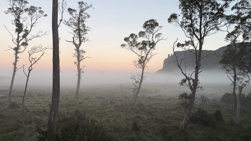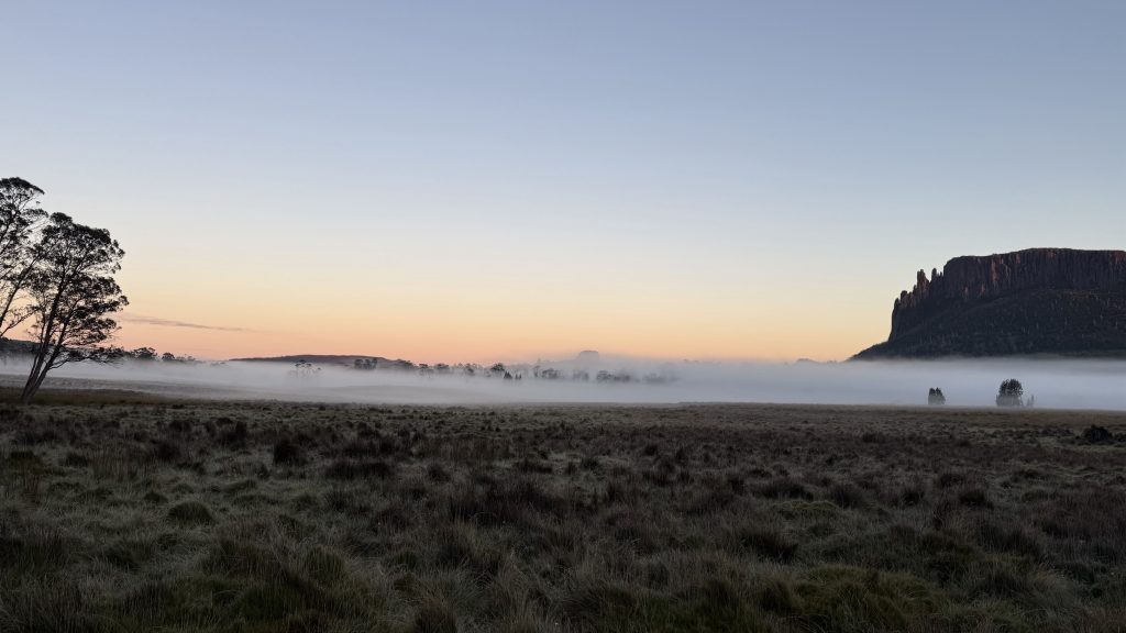 Four degrees overnight, and I wake to a blanket of fog over the plain and Mount Oakleigh looking resplendent in the breaking dawn.