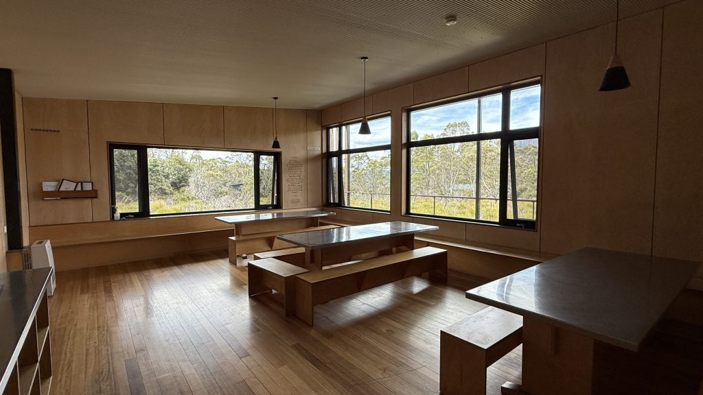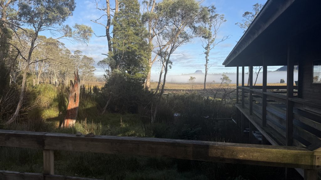 An impromptu stretch session starts up on the verandah and seems to go on for hours while the individual stretchers come and go. People pore over maps, planning out the last few days of their hike. The mess hall tables are stainless steel to solve the problem of stoves tipping over and burning the huts down, and dinners are made and eaten. I eat a spare breakfast muesli that I know I won’t need, then my mashed potato dinner, then a chocolate bar that was reserved for later.