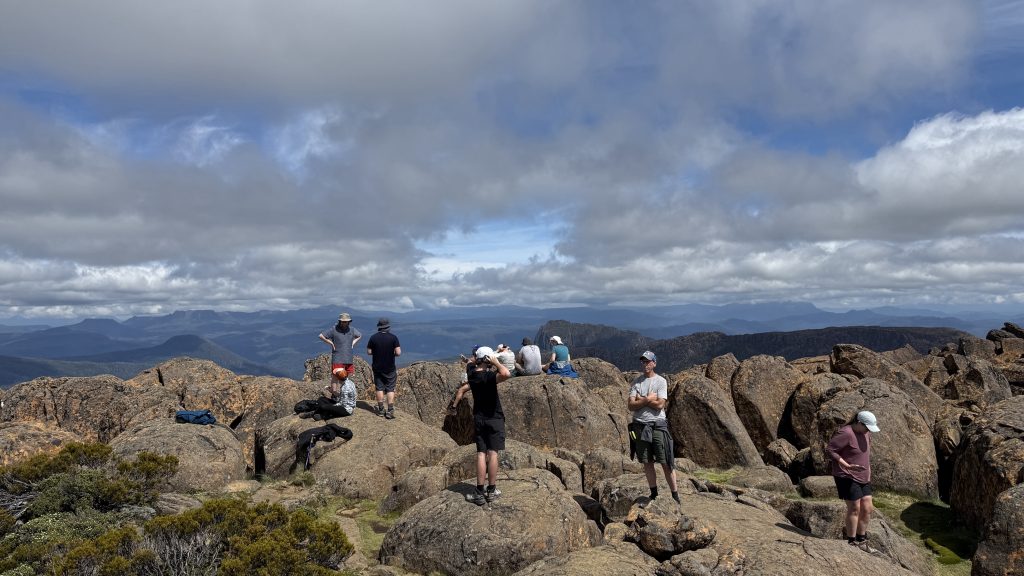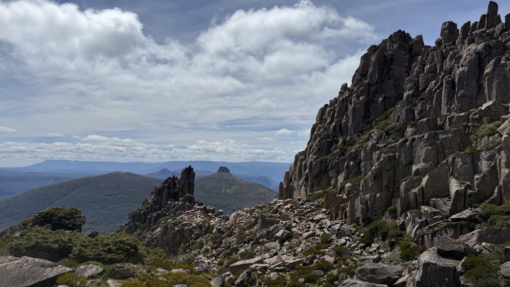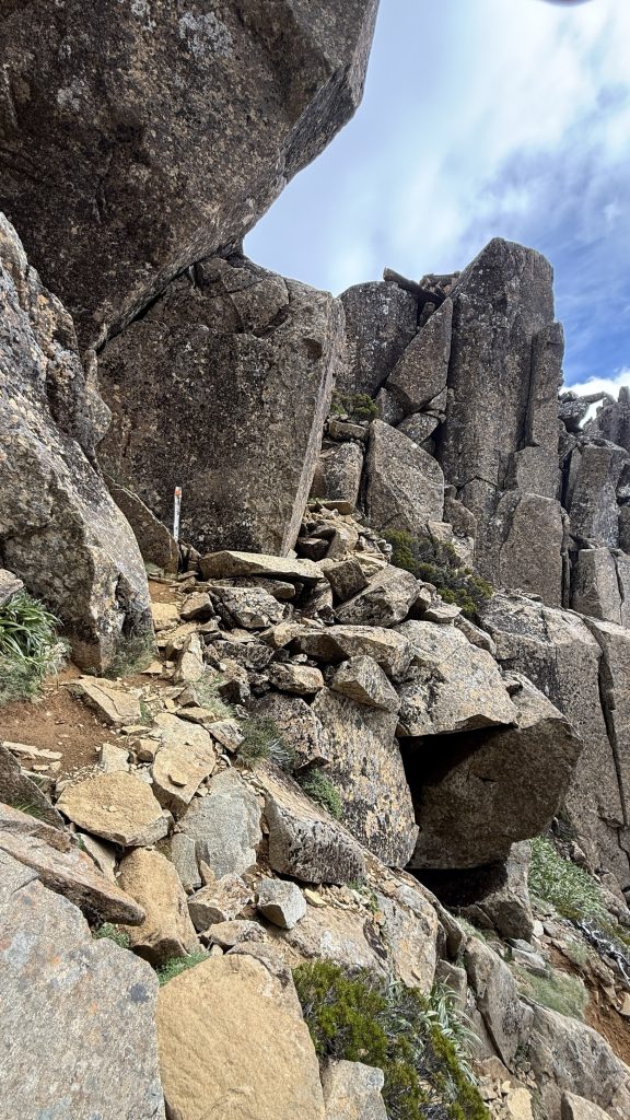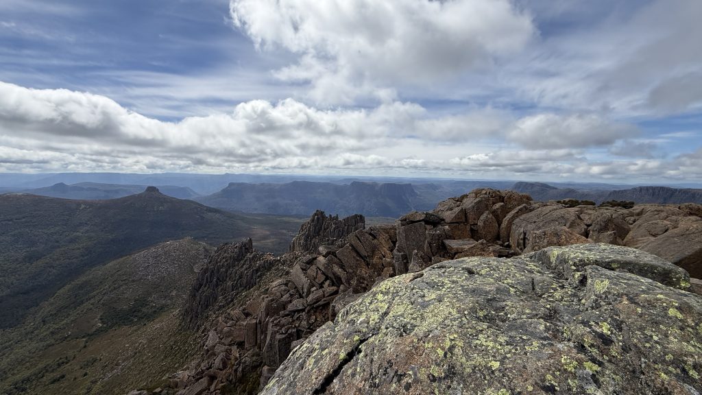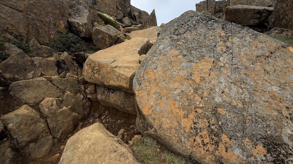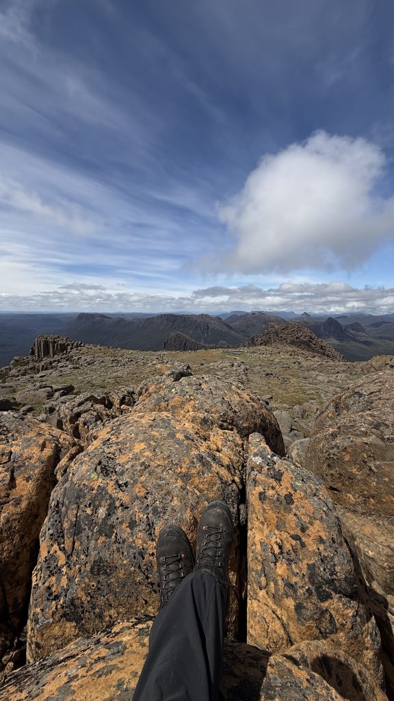 When I reach the top I’m the only one around. There are huge dolerite boulders, with some deep, narrow crevices between them. I climb the rocks to the highest point. My advice for anyone wanting to do the same is: bring harness, belay and a change of shorts.