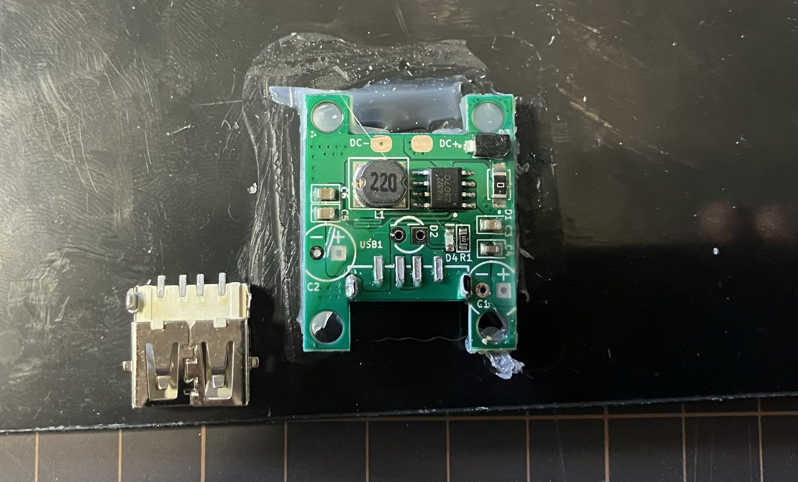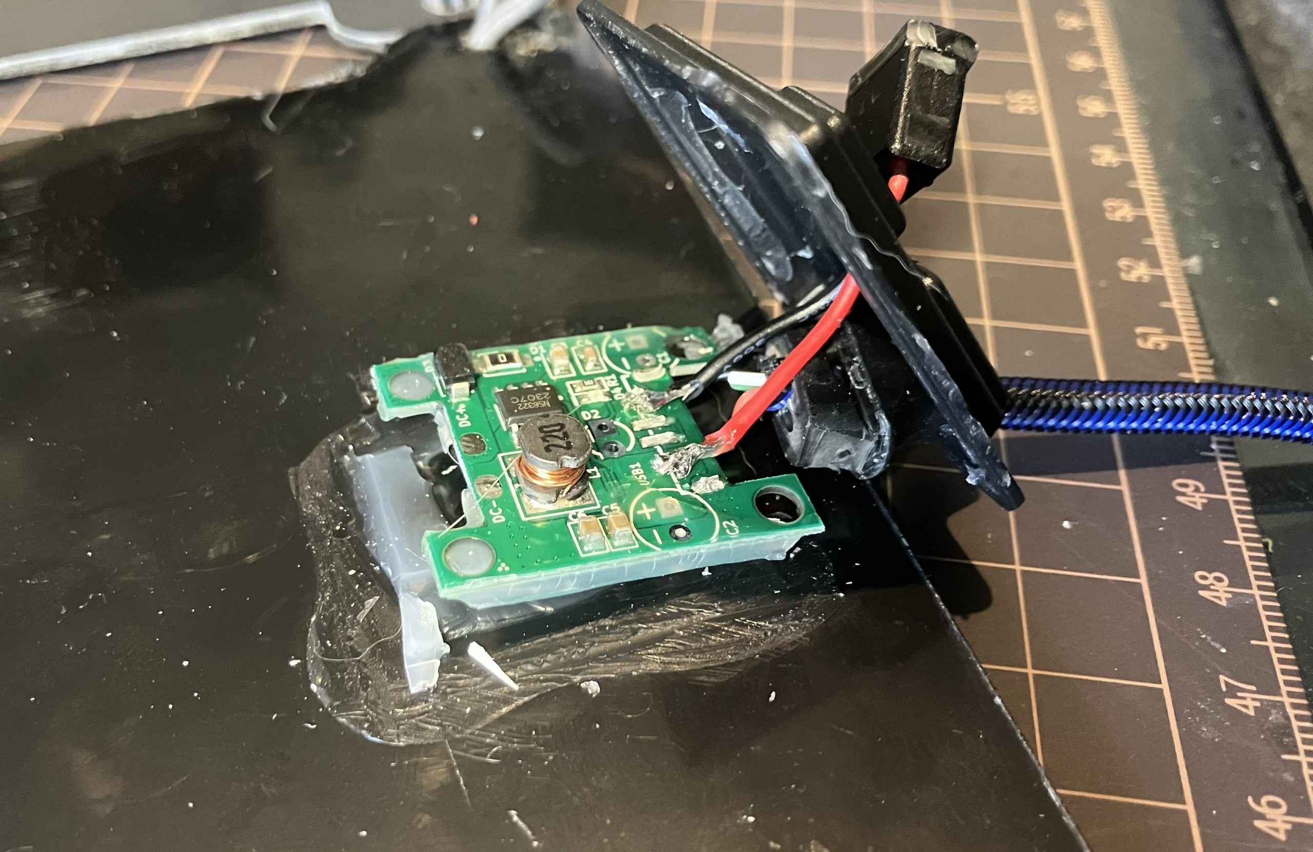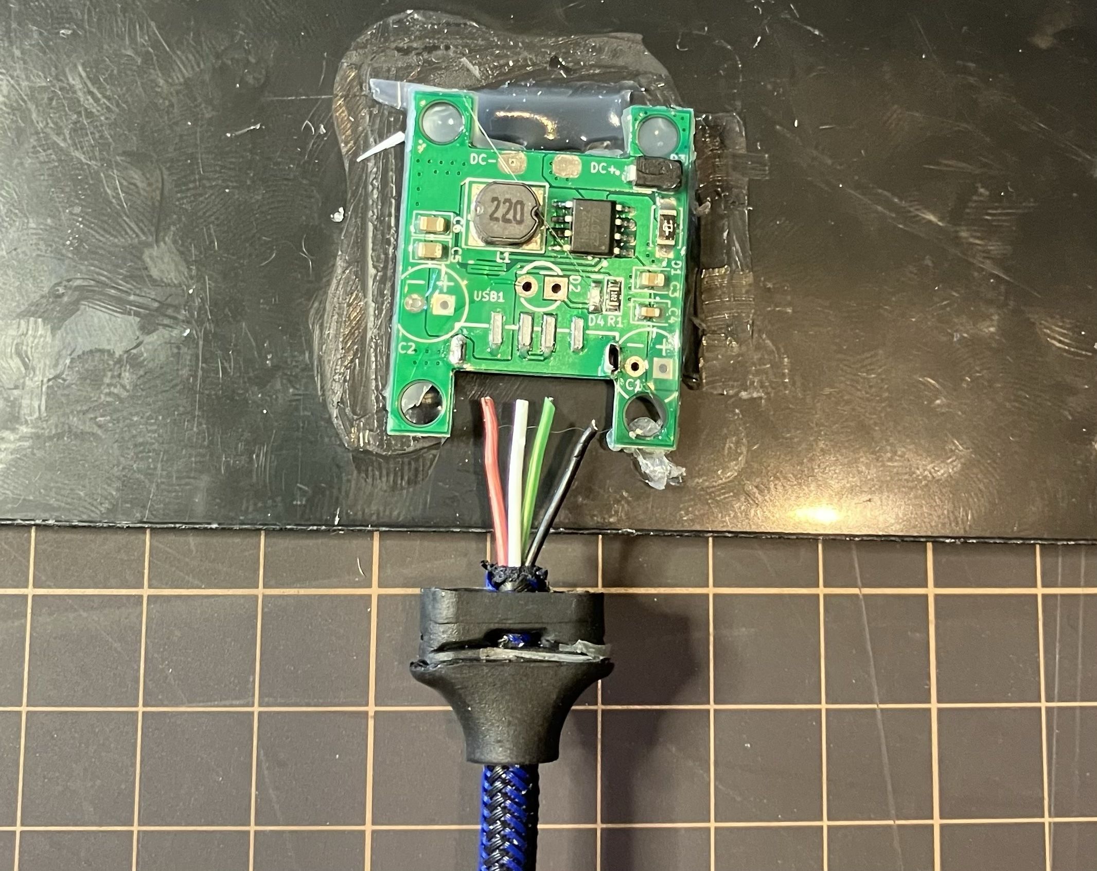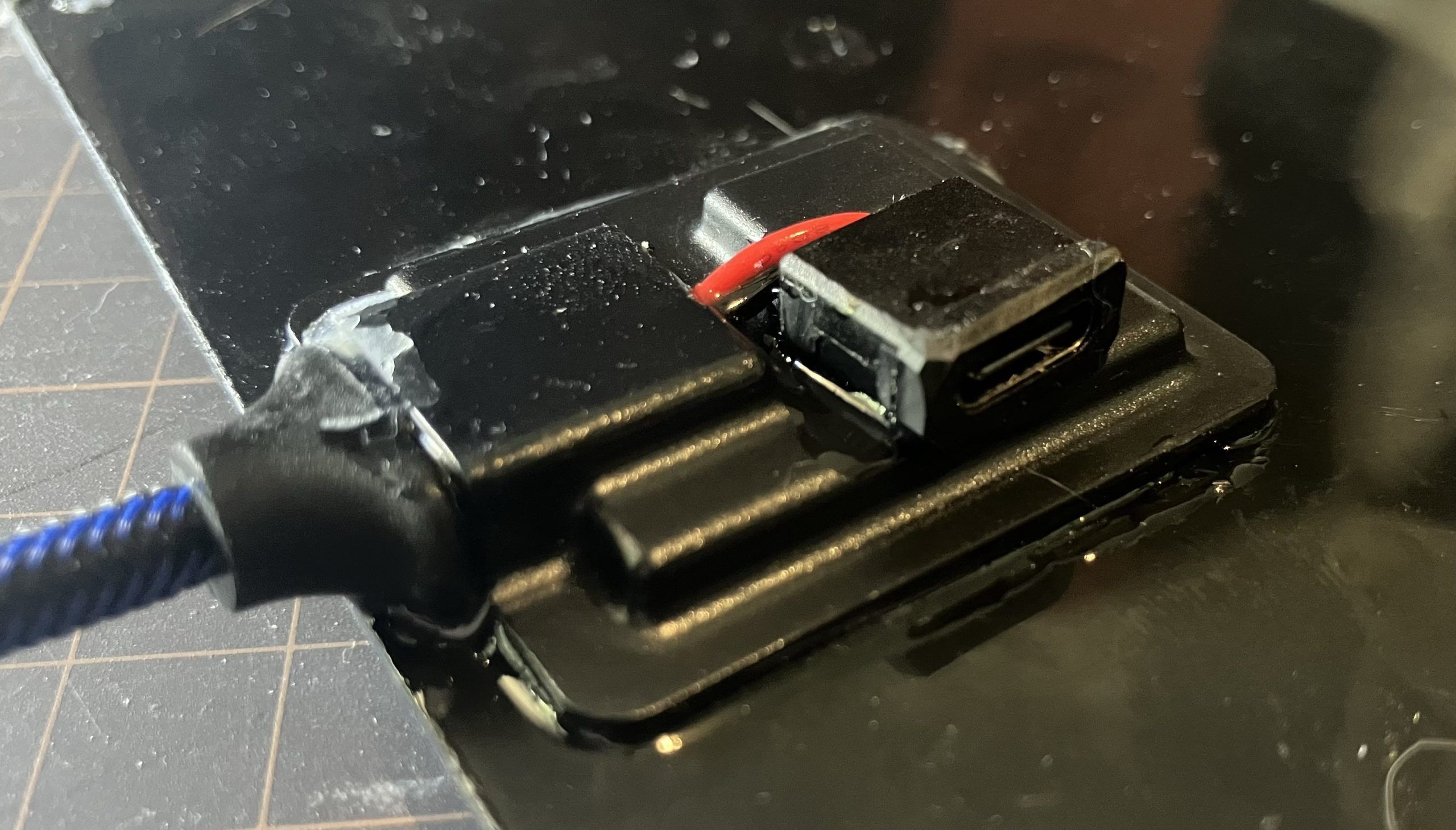 If you just want a USB C pigtail, you can stop here. You’d heat the hot glue with a hair drier or heat gun to stick the board back down, and use two-part epoxy to stick the cover on and seal where the cable comes out. Clamp in place while the epoxy dries using clothes pegs, clamps, weights or tape.