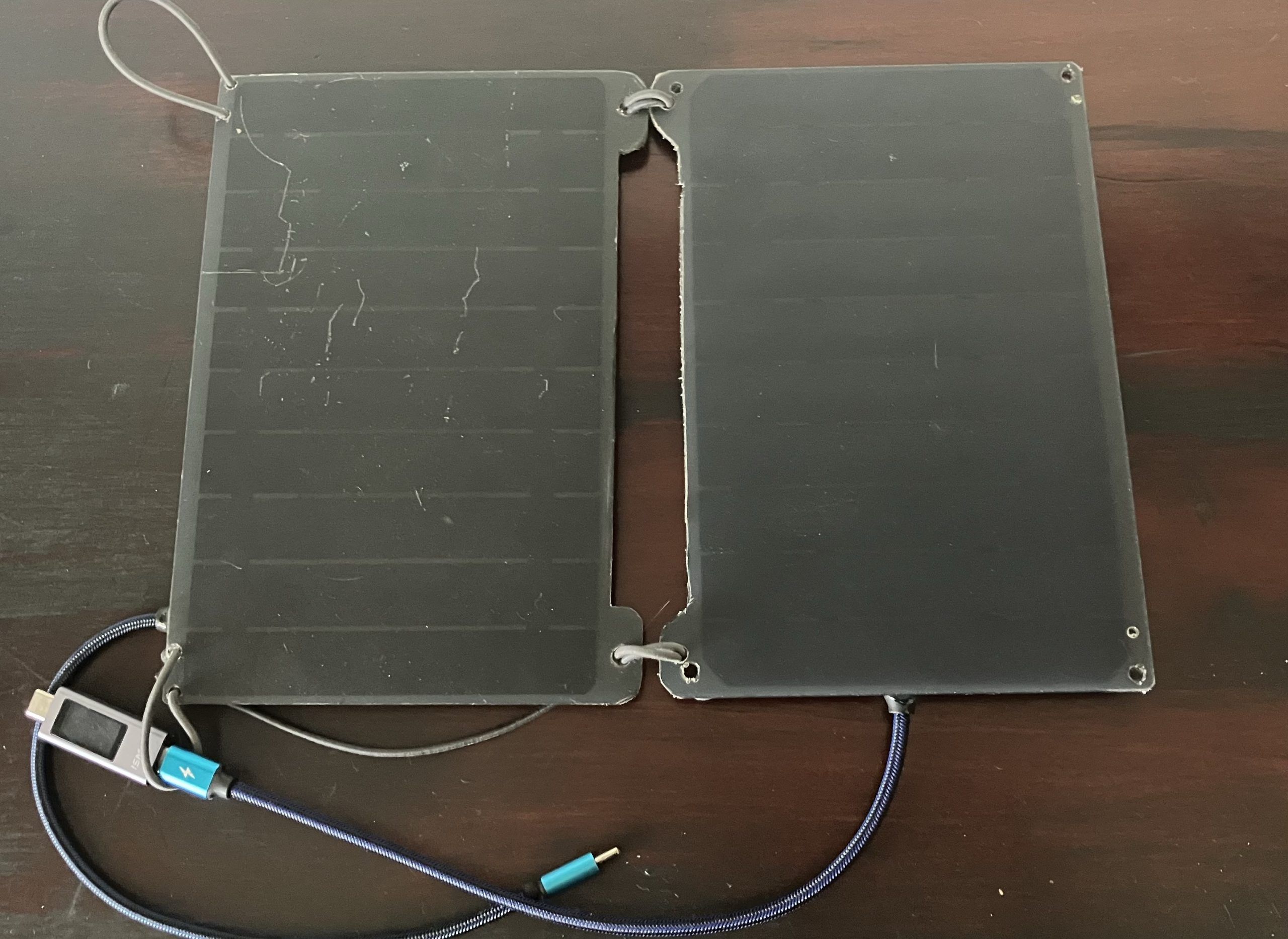 I used a USB voltmeter/ammeter to test each panel separately and to test the output with both panels together. Interestingly, the old panel I used on the AAWT was putting out 0.3A, while the new one was putting out 0.5A. Plugged together I was happily getting 0.8A. I think I’ll order a replacement for the old panel and see if it performs better.