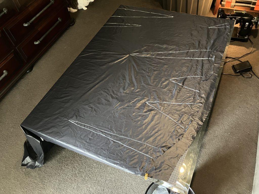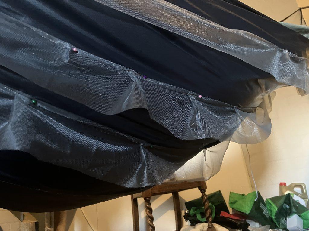 I drew lines on the inner layer with a chalk marker to divide it into nine equal sections (keeping them equidistant along the length of this weird shape was fun) then pinned the baffles in place. I would have preferred something other than pins, which make small holes in the downproof fabric, but for putting them in place while hanging upside down, pins work well. Last time I made an underquilt I cut long, curved baffles to get the differential along the length of the quilt. This time I pleated straight baffles. Next time I’ll definitely do the long curved baffles again. It made getting the length of the outer shell right easier. Baffles are nominally 2.5″. Should be good for about -12ºC/10f