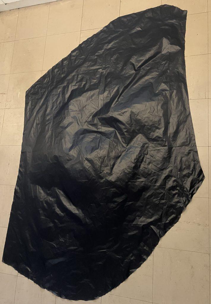 That made my brain melt, so I abandoned it and instead cut a shape that covered me in the three positions I sleep in. Throughout the project, I used sewing clips larks-headed on temporary shock cord clews to hold it in place (very helpful!), and my partner or a heavy doona in the hammock as a surrogate body. This is the shape I ended up with for the piece of fabric that would form the inner layer: