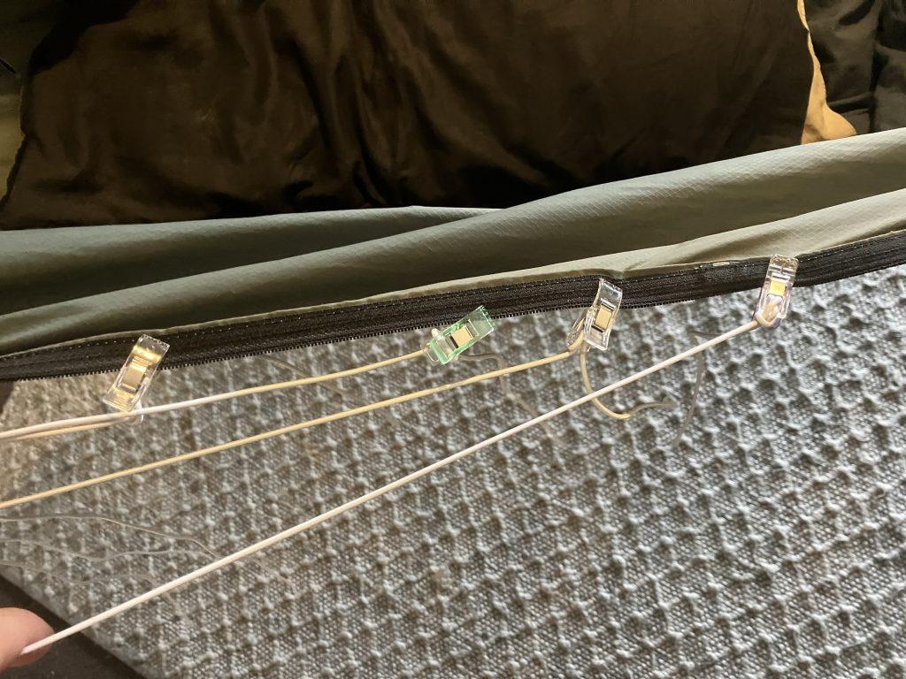 Once the baffles were sewn to the inner shell, I had to attach the outer. Don’t forget to account for the outer edge of the quilt, same height as the baffles. For this part of the project I ended up drawing the baffle width line, then hanging the quilt under the hammock (from the sewing clips on shock cord, with a heavy doona and pillows mocking my body) so I could pin it to the baffle while seeing the way the fabric hung/pulled, then took it to the sewing machine and sewed. You can only do this one baffle at a time for topological reasons. There was a lot of back and forth.