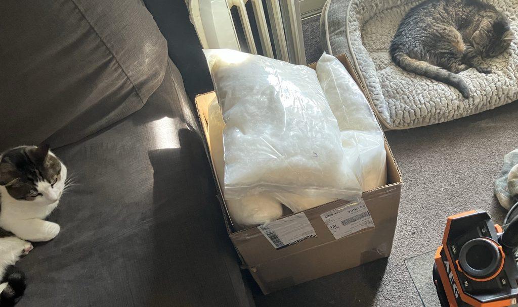 You can in theory determine how much down goes in each chamber mathematically, but my chambers were a non-euclidian eldritch horror, so I eyeballed it. Stuff a chamber, roll and pin/clip the hem closed, then move to the next one. Make sure the filled chambers are well closed, or you’ll blow down out of it when you fill the next one and make a big mess. I ended up accidentally overstuffing most of the chambers significantly, then going back and removing excess down from each tube. It may still be slightly overstuffed, but I’m okay with that.