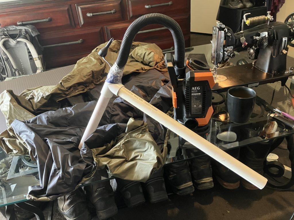 Once the two sides were sewn to the baffles I sewed one end shut with a rolled hem and prepared myself mentally for a blizzard of down. A venturi “down eductor” is definitely the way to go when stuffing down. You can get 3d printed ones, but this is unnecessary; a blower, PVC tee and two tubes is all you need. Tape the blower to the tee such that the blower nozzle projects past the middle of the tee. Remove some down from the packet into a large tub and break up any clumps. You want the down loose and at full loft prior to stuffing. You will make a mess.