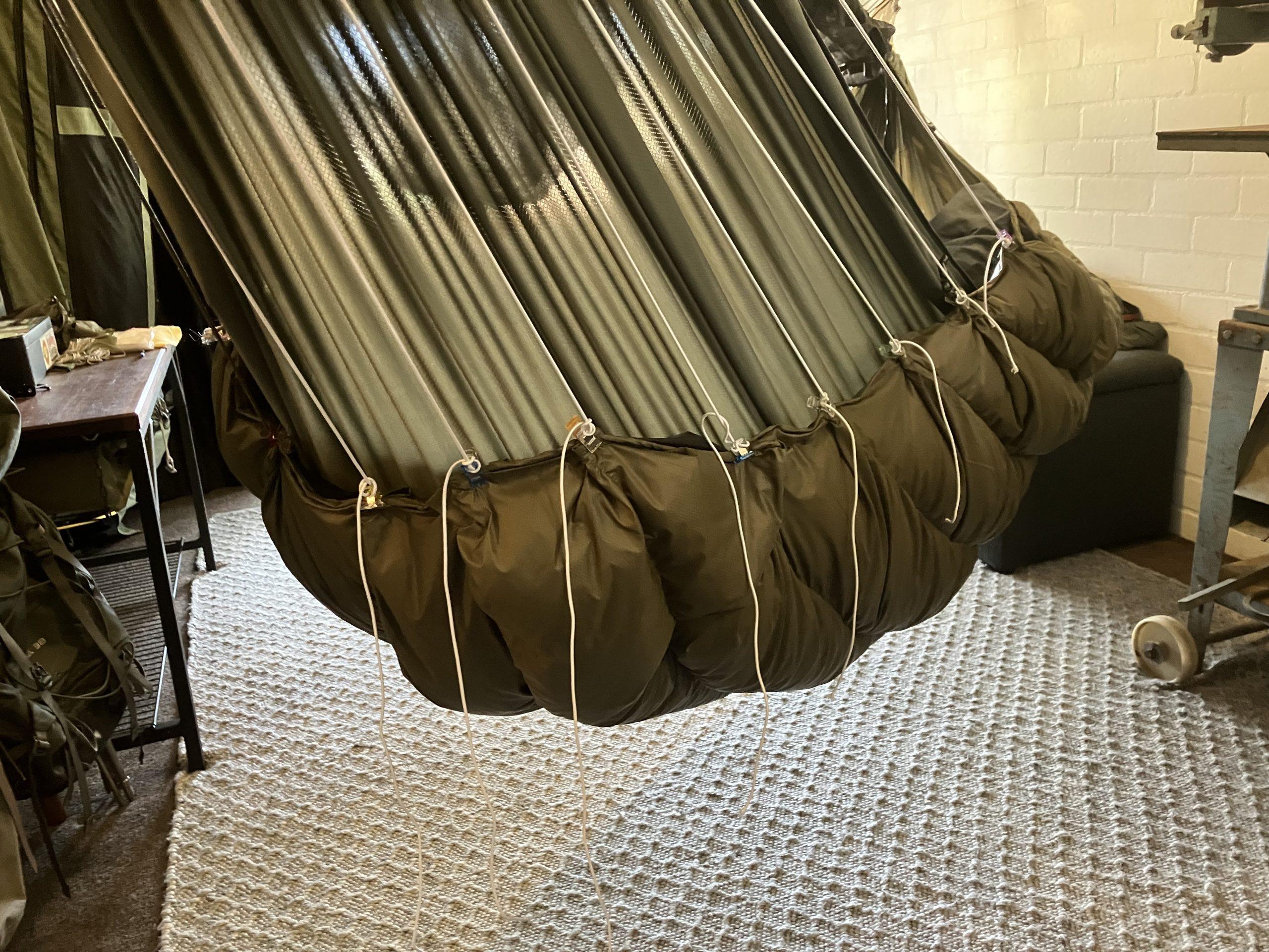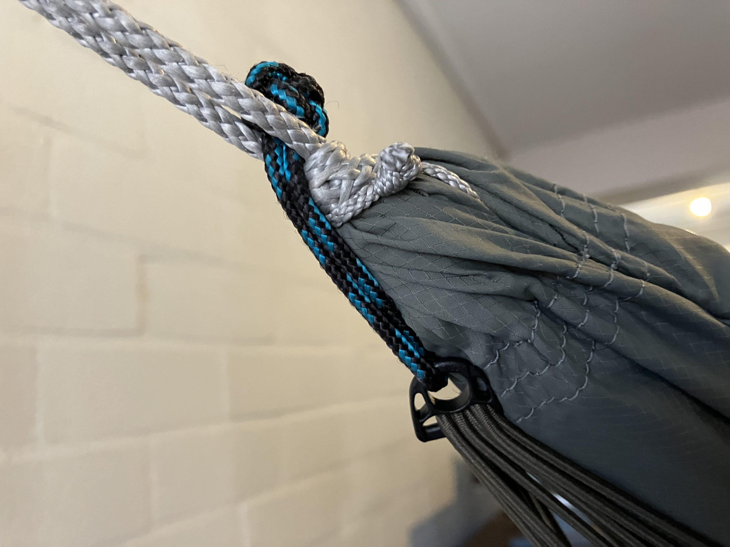 All that was left was to rig it. I used 3/32″ shock cord. Each nettle (many nettles make a clew) is tied off to one grosgrain loop, doubles over a beastie dee (equalising the tension), then ties off to another grosgrain loop with a sliding knot that allows adjustment to dial in the tightness. A diamond knot attached to the beastie dee slips through the hammock’s continuous loop and just stays there.