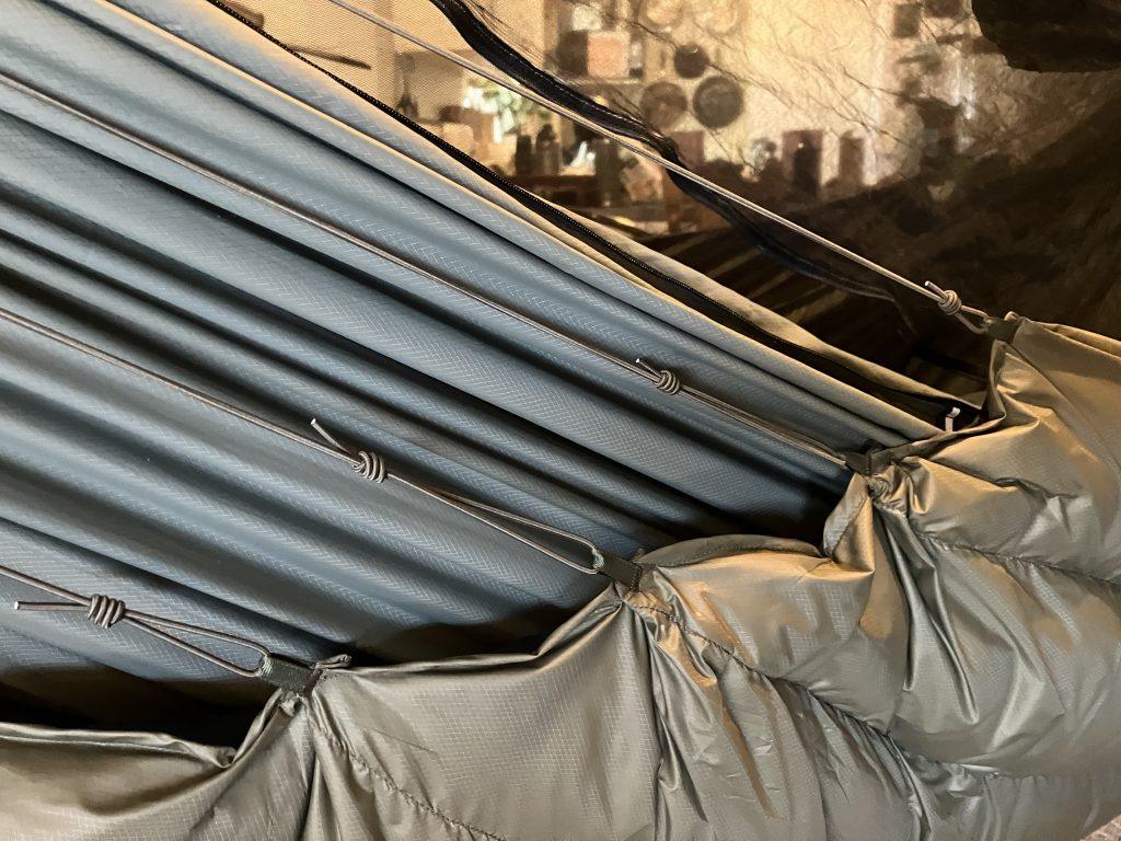 Once the quilt was stuffed I hemmed the final end and hung it under the hammock, pinned and pleated the short ends slightly at the ends of the baffles, just to reduce scalloping that could allow drafts. I sewed grosgrain loops along the short ends to attach my suspension to.